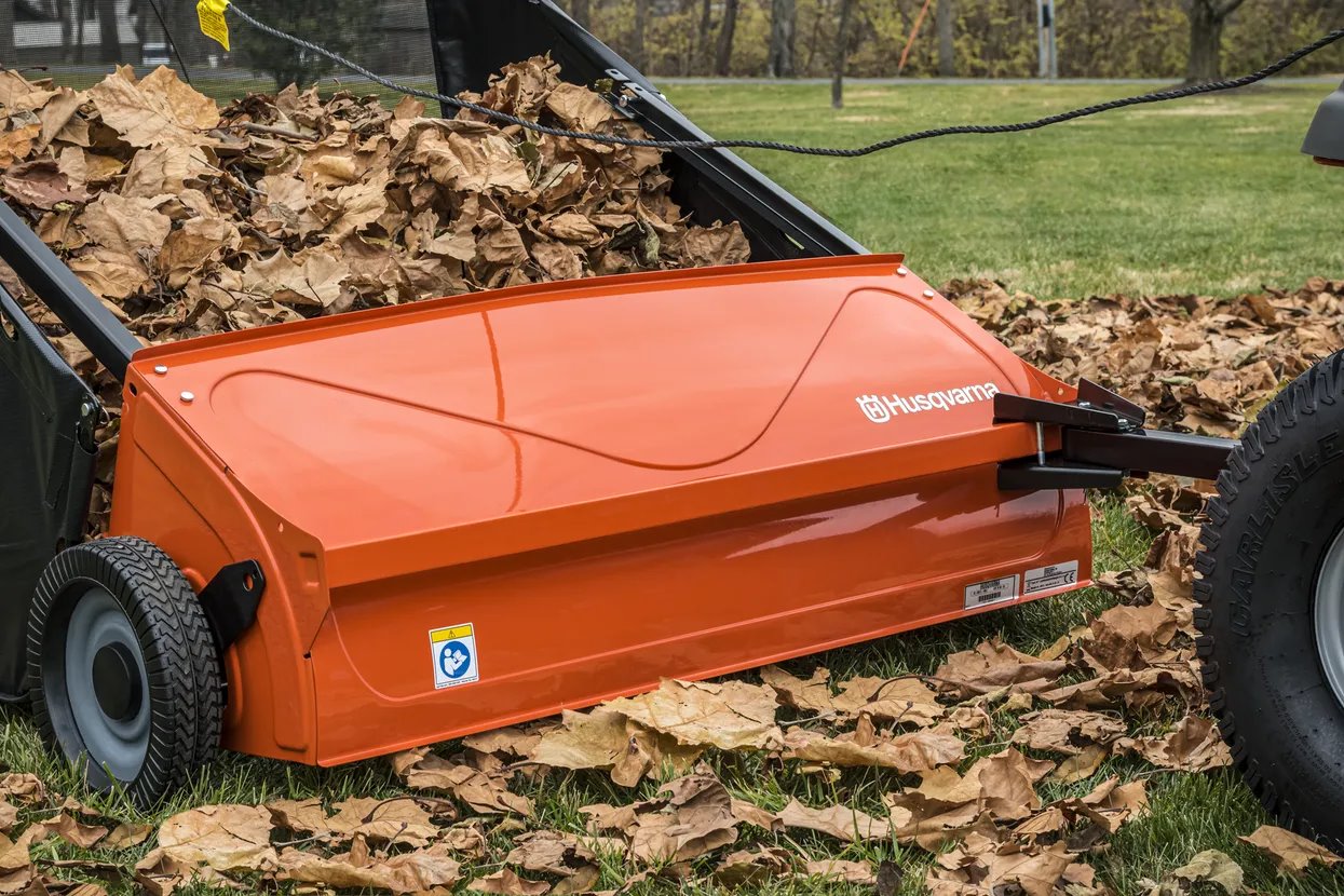 Sweeper/ uppsamlare för effektiv uppsamling av gräsklipp. Justerbar höjdinställning. Kan tömmas från förarstolen.