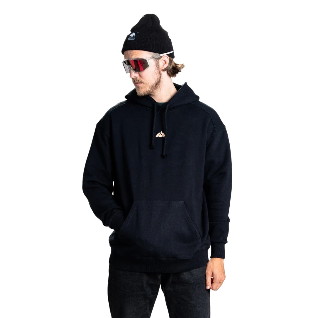Tröjan har en svart färg med ett kontrasterande tryck likt en solnedgång. Tillverkad av 100% ekologisk bomull med brushed fleece-finish, erbjuder denna huvtröja en exceptionellt mjuk och bekväm känsla. Tröjan har en avslappnad / medium fit passform.