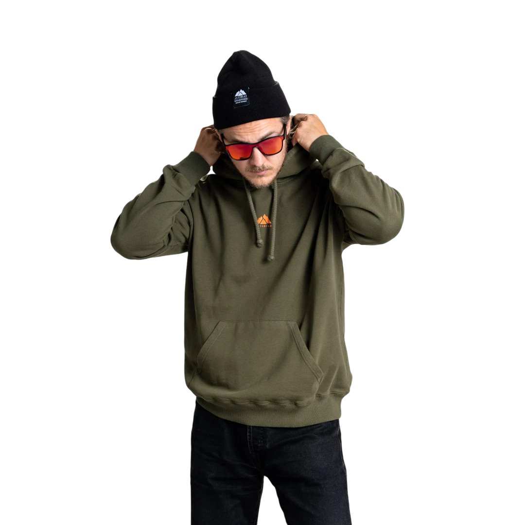 Tröjan har en dov grön färg med ett kontrasterande orange tryck som ger ett distinkt och iögonfallande utseende. Tillverkad av 100% ekologisk bomull med brushed fleece-finish, erbjuder denna huvtröja en exceptionellt mjuk och bekväm känsla. Tröjan har en avslappnad / medium fit passform.